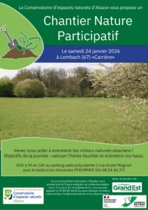 Le Conservatoire d’espaces naturels d’Alsace organise, samedi 24 janvier 2026, un chantier nature participatif pour l’entretien écologique du site « Carrière » à Lembach Renseignements au 03 89 83 34 10 ou par mail à antenne.bas-rhin@conservatoire-sites-alsaciens.eu Pour plus d’info